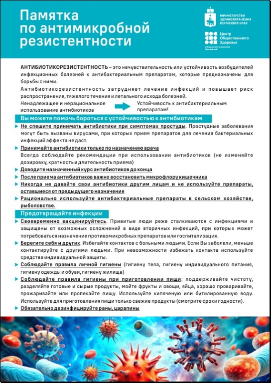 В рамках тематических недель по профилактике заболеваний и поддержке ЗОЖ в период с 17 по 23 ноября 2025 года проводится Неделя борьбы с антимикробной резистентностью (в честь Всемирной недели повышения осведомленности о проблеме устойчивости к противомикробным препаратам).