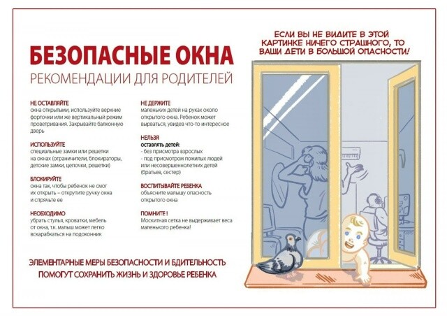 С наступлением теплой погоды появляется еще одна опасность для маленьких детей – открытые окна в квартирах. Малыши тянутся к открытым окнам и совершенно не задумываются о том, насколько это опасно, поэтому об этом должны позаботиться взрослые. Для обеспечения безопасности детей необходимо, чтобы они находились под вашим контролем, не доверяйте присмотр старшим детям. Элементарные меры безопасности помогут сохранить жизнь и здоровье ваших детей! Берегите своих детей!